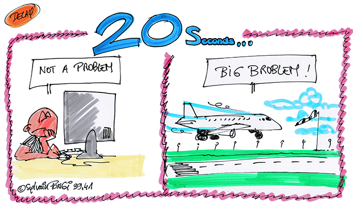 Le dessin ci-dessus synthétise les propos de l'orateur: un délai de 20 secondes dans la transmission d'un positionnement, GPS par exemple, peut être anodin comme avoir de lourdes conséquences.
